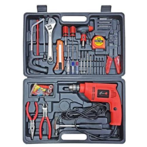 - ACCESORIES- include 6 pieces of drill bit wood measuring 1.69 mm 2.45 mm 2.74 mm and 3.6 mm 4.20mm 8 Sockets 1 Wire cutter cum Stripper 1 Long nose piler 1 Diagonal piler 1 Wood working pencil 1 Line tester 2 Medium screwdriver 2 Long screwdriver 2 Small screwdriver 1 Hand Saw 1 3m Tape 8in Spanner 1 Chuck key 11 Screw driver bits 4 Long screwdriver bits 1 Depth Gauge 1 Hammer 1 Big Cutter 1 Screw Driver Holder 52 Screw wall Ploughs 1 Drill Machine hand holder and one plastic carry case.